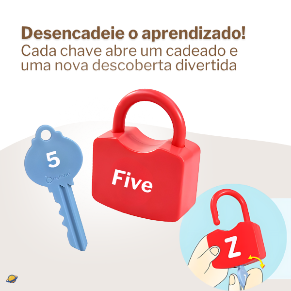 Cada fechadura possui um número e uma chave correspondente — a criança precisa encontrar o par certo para abrir e desbloquear.