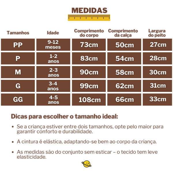 O corte do conjunto é confortável e ideal para o dia a dia da criança – seja em casa, na escolinha ou em passeios em família. Seu filho pode correr, brincar e se movimentar com total liberdade, sem abrir mão do conforto.