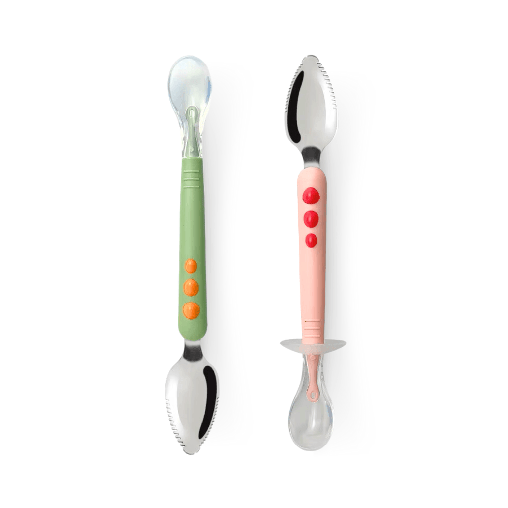 Além disso, o outro lado apresenta uma ponta em silicone macio, projetada para levar o alimento diretamente à boca do bebê, proporcionando uma alimentação suave e confortável.