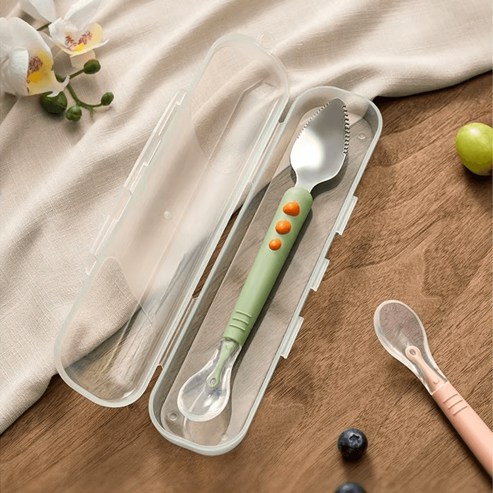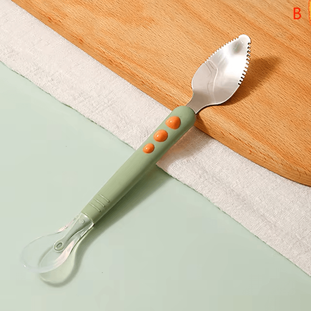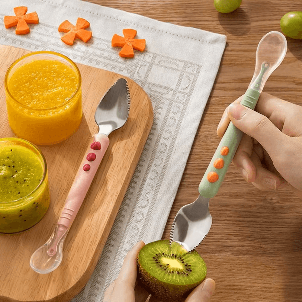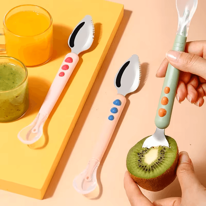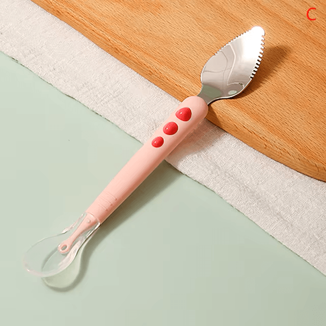 Colher Raspa Fruta 2 Em 1 da Brincarzi, a solução perfeita para tornar a alimentação do seu bebê ainda mais prática e segura!